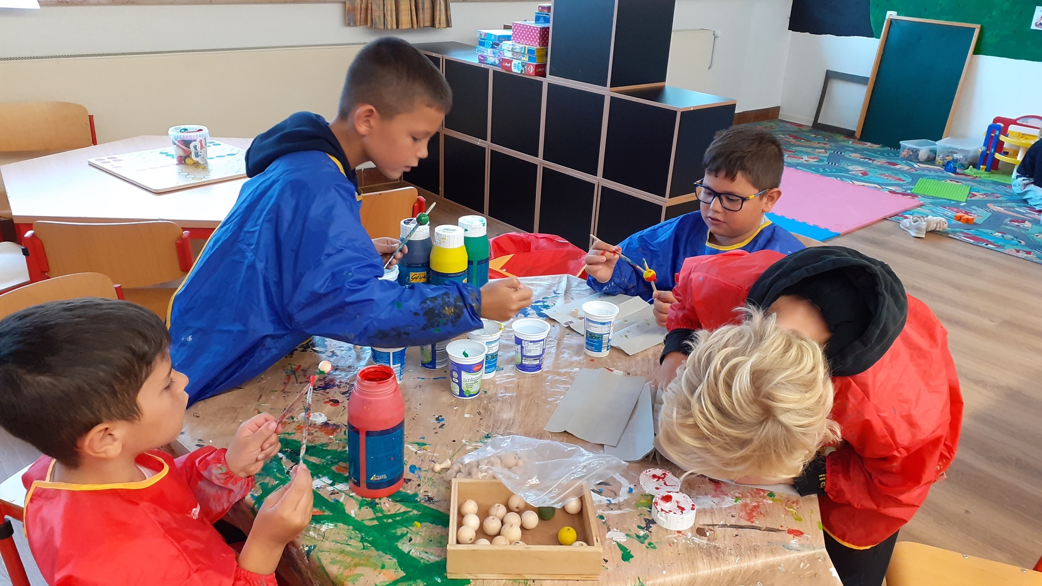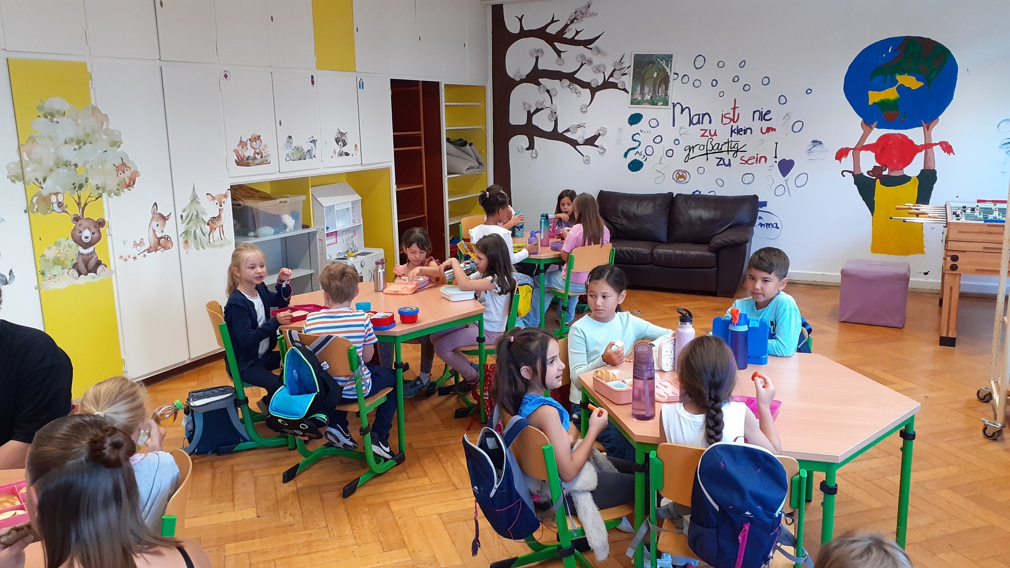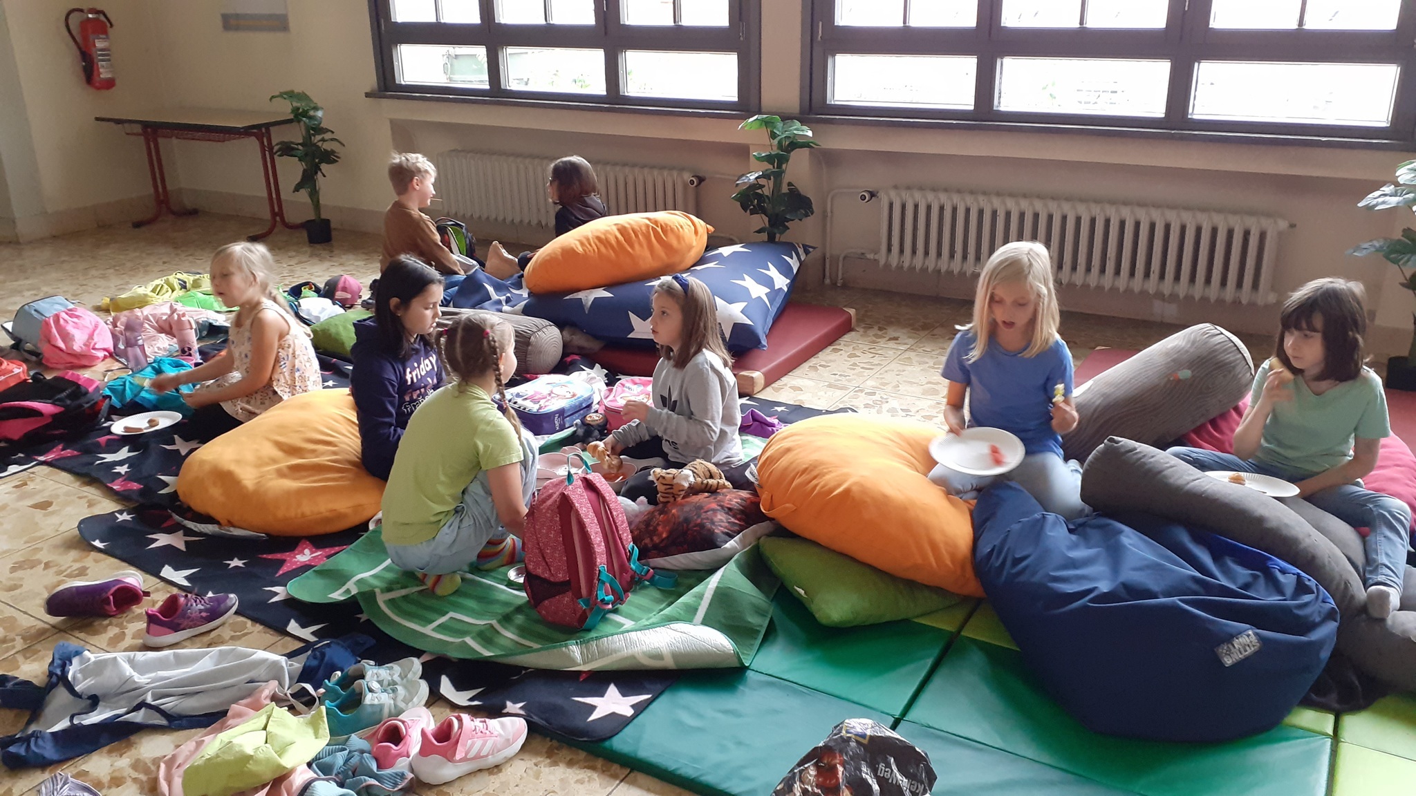 In der letzten Woche wurde es dann ganz schön voll – 16 zukünftige Erstklässler nahmen an der Betreuung teil, so viele wie noch nie zuvor! Gemeinsam haben wir bunte Waffeln gebacken, Herbst-Deko für die Fenster und Traumfänger für zu Hause gebastelt. Bei der Schlechtwetter-Spieleolympiade haben wir im ganzen Haus verschiedene Spielstationen angeboten und die Kinder konnten dort ihr Können unter Beweis stellen. Das Highlight der Woche war dann der „Chill-Tag“ am Freitag. Bei Kakao und Keksen hörten die Kinder in ihren selbstgebauten Höhlen spannende Hörspiele und konnten sich nochmal richtig ausruhen, bevor für die meisten am Montag (und für die zukünftigen Erstklässler am Donnerstag) der Schulalltag begann.